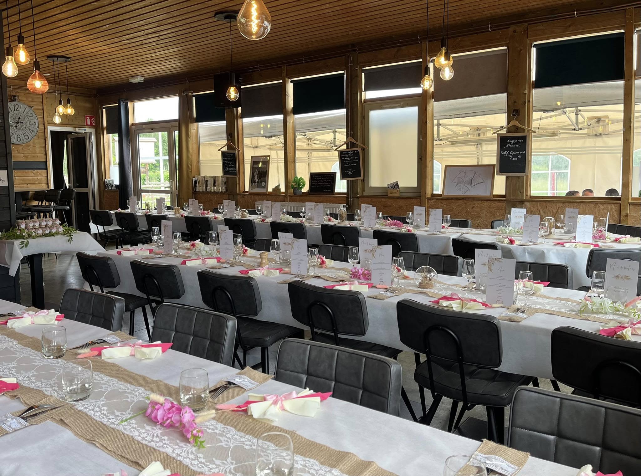 Auberge spécialisée dans les week-ends festifs, mariages, anniversaires jusqu'à 110 personnes assises. Belle terrasse couverte pour les apéritifs et grand parc arboré pour cérémonie laïque et vin d'honneur.